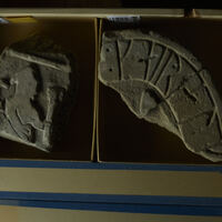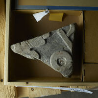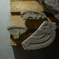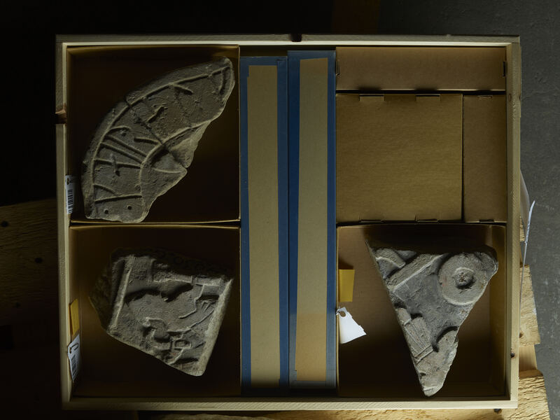 The larger pair of fragments features parts of two people, both turned right, each of which is holding an object in his left hand in front of him. The one in front probably wields an axe, the short blade of which is partly lost, however. The other figure possibly holds a sickle. Behind him, there is a roundel with a large cavity in its centre (Lindqvist 1941/42 II, p. 75f.).