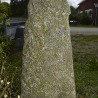 Measurements, Material and Condition Limestone. Width at the lower part of the ornamented section 0.90 m, total height including the root 1.64 m. The height of the ornamented surface is 0.62 m. Thickness 0.15 m. The height of the runes is 5 cm (GR II, p. 114–115).