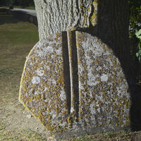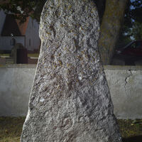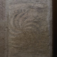 Measurements, Material and Condition The upper part is broken off almost straight right under the central whorl motif. The lower part is lighter in color, the stone seems harder, and it has a much smoother surface, probably because it has been walked on in the church's floor. On the lower right side, there are two vertical grooves (in addition to a shallower one on the left side), which likely stem from later, medieval activity (Oehrl 2019a, pp. 41; 105 f.). Swedish: sliprännor.