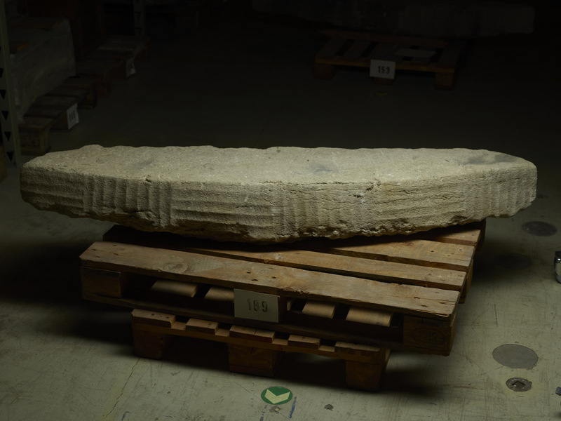 “Nr. a is up to 24 cm thick. The upper side is smooth, one of the narrow sides is 175 cm long, with a chord arc of 17 cm. It has been hewn with a gouge that produced 3.5 cm wide grooves, which alternately run length- and crosswise to the side’s longitudinal direction. Those running across the side are in groups of eight or nine parallel grooves, those running along it in groups of only five. The upper side is not separated from the worked side by a clear chamfer. The maximum width of the slab is 40 cm. Both short sides are hewn at an acute angle towards the hewn side.
