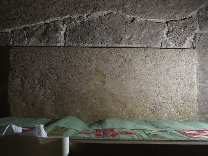 Measurements, Material and Condition The step stone represents an accurately worked flat cuboid shape with a length of 1.59, a width of 0.66, and a thickness of 0.08 m. The color of the limestone is a dark and slightly reddish grey, and no notable fossil inclusions are visible. The middle part of the surface next to the altar is completely abraded as this is the part of the step where the priest stands when celebrating the liturgy. Only the edge areas of the surface in the north, south and west show some remains of the original surface.