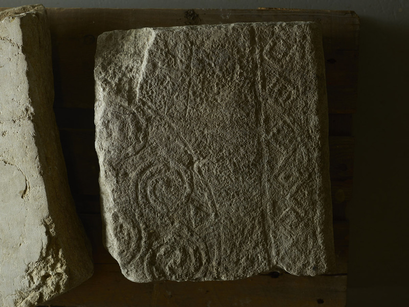 Övre delen av en tidig bildsten (period A), 32 x 36 cm. Spår av kantdekor och en virvel. Möjligen en figur med rund sköld över virveln.