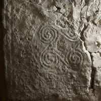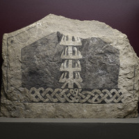 Description of Ornament and Images The stone has carving from two periods, firstly, traces of an original picture stone carving, probably from the 8th–10th century, and secondly, runic ornament and a runic inscription from the 11th century. The head of the runic animal is partly carved in half relief. Downward on the left, under the head, there are remains of a horizontal chequered pattern that is older than the rune carving. Along the edges there are traces of a cut border line, which according to Gustavson belongs to the older carving. There was a relief border along the edges. Above the ribbons with the inscription, there is a 6-cm large equal-armed cross. It cannot be judged whether the cross belonged to the older carving (Lindqvist 1941/1942 II, pp. 28–29; Gustavson in GR 3: Boge socken, G 276; Rundkvist 2012, p. 152). Lindqvist suggests that the picture stone had all but lost its original carving by weathering before the runic inscription was applied to it. The original border ornament was of similar width as the later-added rune band, but it was c. 3 cm closer to the edge of the stone. The shape of the slab is unusual as compared to other 11th-century gotlandic runestones; it probably was not reshaped (Lindquist 1941/1942 II, pp. 28–29).
