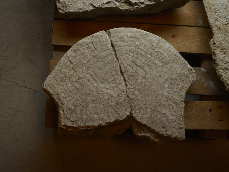 Measurements, Material and Condition The limestone slab is up to 10 cm thick, and its obverse is relatively even. “The narrow sides are hewn at right angles towards the obverse to a width of 6 cm and with an approximately 1 cm wide chamfer in between. The reverse is rough and unworked. The preserved fragment, which is composed of two matching pieces, is 38 cm high, measures 52 cm between the upper corners, and 41 cm at the broken edge” (Lindqvist 1941/42, p. 64). The two matching pieces represent the left and the right half of the head of a middle-type picture stone.