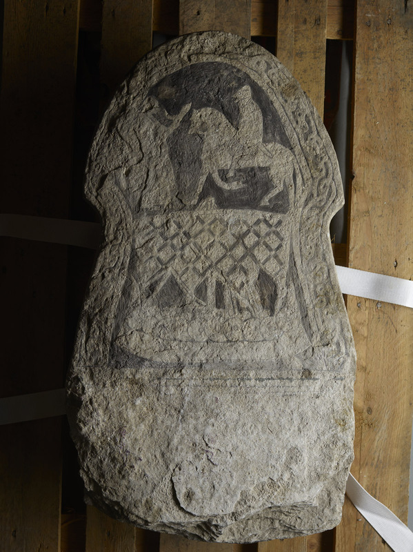 The figure in the left half of the head field can be interpreted in different ways, but Lindqvist’s description of the carvings is particularly detailed (1941/42 II, p. 61): “In front of the horseman, on the same ʻground lineʼ, a person is standing, the details of which have been lost due to flaking. The interpretation of this person was a problem that GG [Gabriel Gustafson], FN [Fredrik Nordin], and OS [Olof Sörling] frequently debated, but never finally solved. Alternative no. 1 [ibid. II, fig. 381] includes: a man with knee-length garb, holding a spear slightly tilted forwards, towards the horseman; the slightly crooked spearhead is at a level with the horse’s ear. Alternative no. 2 [ibid. II, fig. 382, 384], however, put forward a woman with a floor-length dress (at the front of which there is a strip of constant width that corresponds to the front lower leg in alternative no. 1); her head is looking rather masculine and does not quite reach the same level as the horse’s mouth. Above the woman, there is a bird (the head and long neck of which, pointed diagonally upwards, corresponds to the upper part of the spear in alternative no. 1) that appears to be flying towards the horseman. Both wings of this presumed bird are visible and executed in a remarkably realistic way; the feathers of the wings would be implied by short, chiselled lines, in the same manner that commonly was used for the chiselled areas of the background field. Lastly, alternative no. 3 [ibid. I, fig. 116], which SL [Sune Lindqvist] considers the most likely, shows a woman in a full-length dress (possibly with a strip of constant width along the dress’s rear contours that corresponds to the rear lower leg in alternative no. 1) as in alternative no. 2, but of much greater body height; the torso is inclined backwards, of course, because the woman is presenting the horseman with a drinking horn, its almost horizontal mouth facing him (in alternative 1, this is the spearhead, in alternative 2, the bird’s head). The top of the woman’s head is at the same level as the horse’s eye” (Lindqvist 1941/42 II, p. 61).