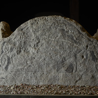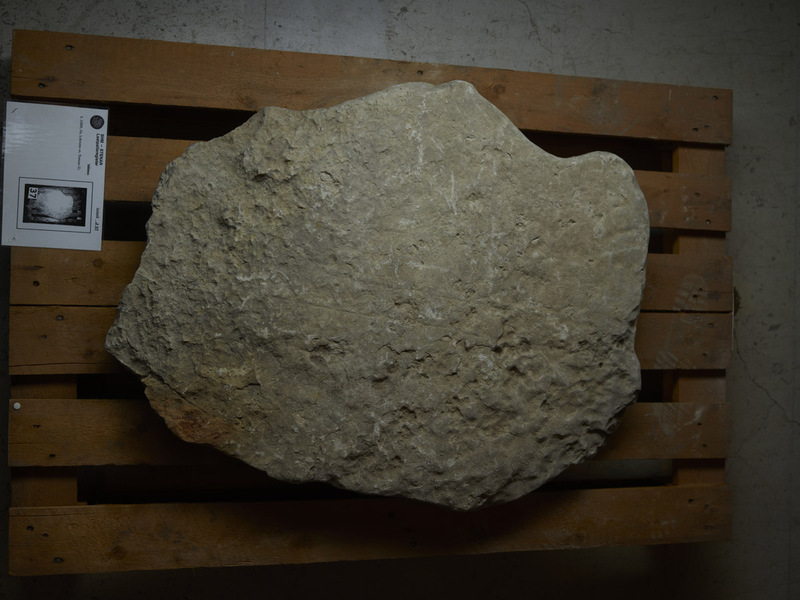 Measurements, Material and Condition “Limestone slab, 8 cm thick at the root, 12 cm at the top. The obverse is naturally even and best preserved in the centre section. Otherwise, it is severely weathered and damaged – especially on the left half. The preserved right narrow side is rounded, the right part of the upper narrow side appears to be levelled close to the obverse und rounded towards the back. It is unclear whether the narrow side was separated from the obverse by a chamfer. The reverse is rough and unworked. The height is 64 cm, 38 cm of which is accounted for by the section above the decoration’s lower edge. At the base, the width now is 82 cm” (Lindqvist 1941/42 II, pp. 99–100). The root seems to be completely preserved. Of the cist-stone’s typical wave-shaped upper edge, only the left protruding corner is broken off.