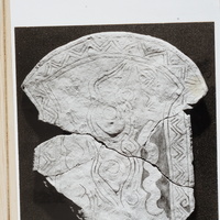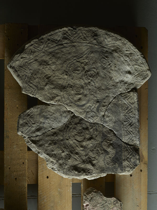 Measurements, Material and Condition The slab represents the almost complete upper part of a small picture stone with its base and root broken off. The surviving limestone slab is broken into four matching pieces, which have the following sizes: 1) 40 x 58 cm, 6 cm thick; 2) 25 x 47 cm, 9 cm thick; 3) 23 x 15 cm, 8cm thick 4) 12 x 21 cm, 4 cm thick. The surface is weathered and, in particular, the decoration in the left half of the image field hard to discern.