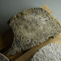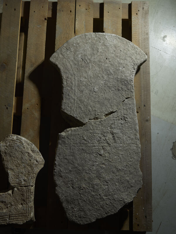 Measurements, Material and Condition “Limestone slab, 8 cm thick. The obverse is even, the narrow sides hewn at right angles towards the obverse and in places feature a clearly discernible, just under 1 cm wide chamfer in between. The reverse is rough and unworked. The total height is 93 cm, of which 60 cm are accounted for by the part above the base. The width between the upper corners is 50 cm” (Lindqvist 1941/42 II, p. 107). The small monument is almost completely preserved but broken into an upper and a lower half. Approximately at half-height of the slab, a small part of the left edge is broken off and missing. The decorated surface is worn or weathered.