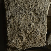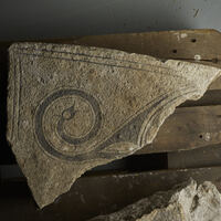 Measurements, Material and Condition A completely intact stele. The surface is quite uneven and it might not have been sanded down at all. In contrast, the sides must have been worked since they look much more even than the root. The root is 0.25 m long, which makes the decorated stele only 0.36 m tall. The circular motifs are created with a comparably deep bas-relief in which the leaves of the rosettes are protruding while the spaces in between (painted in black) have been carved out. These rosettes were not made by compass. HS